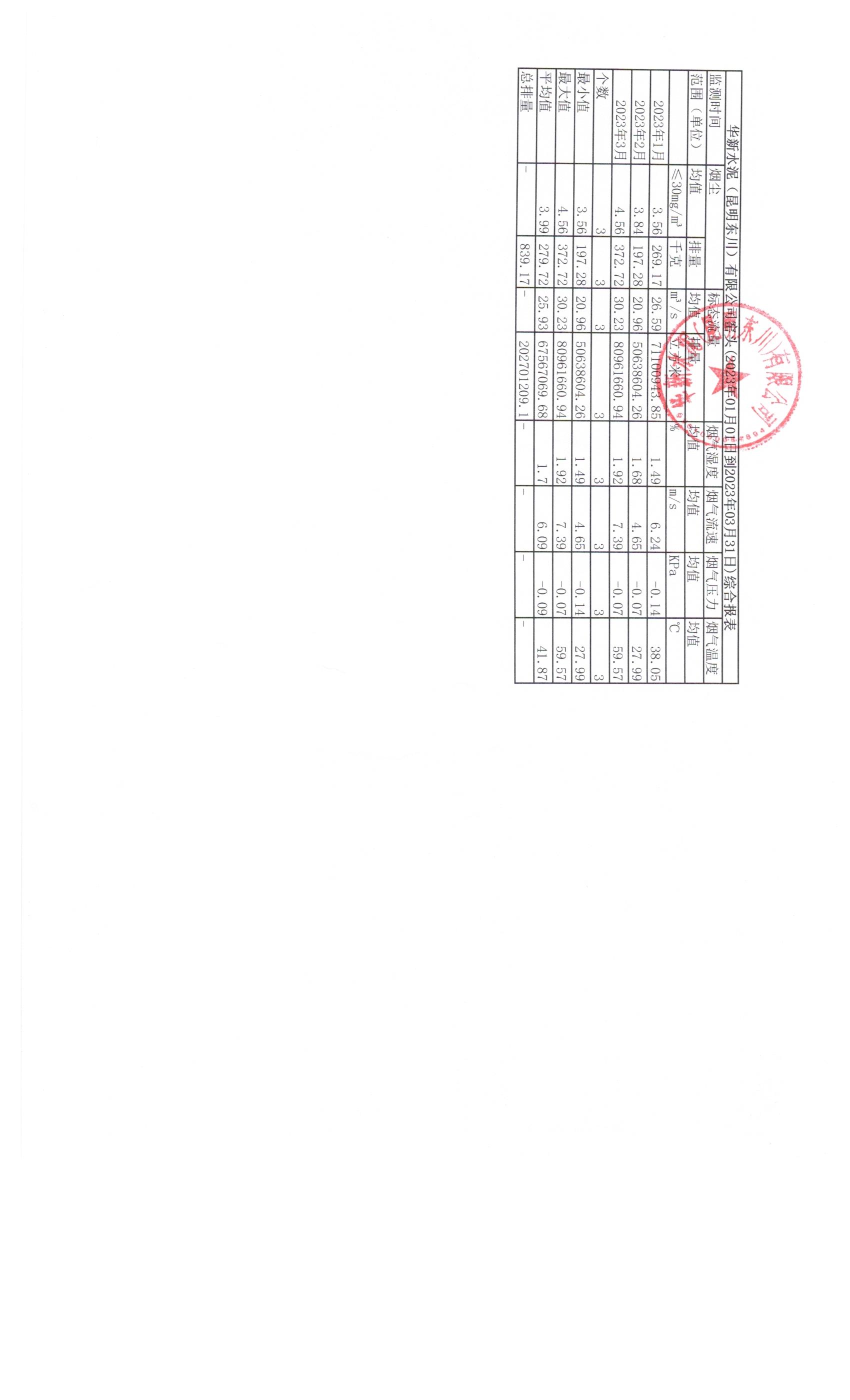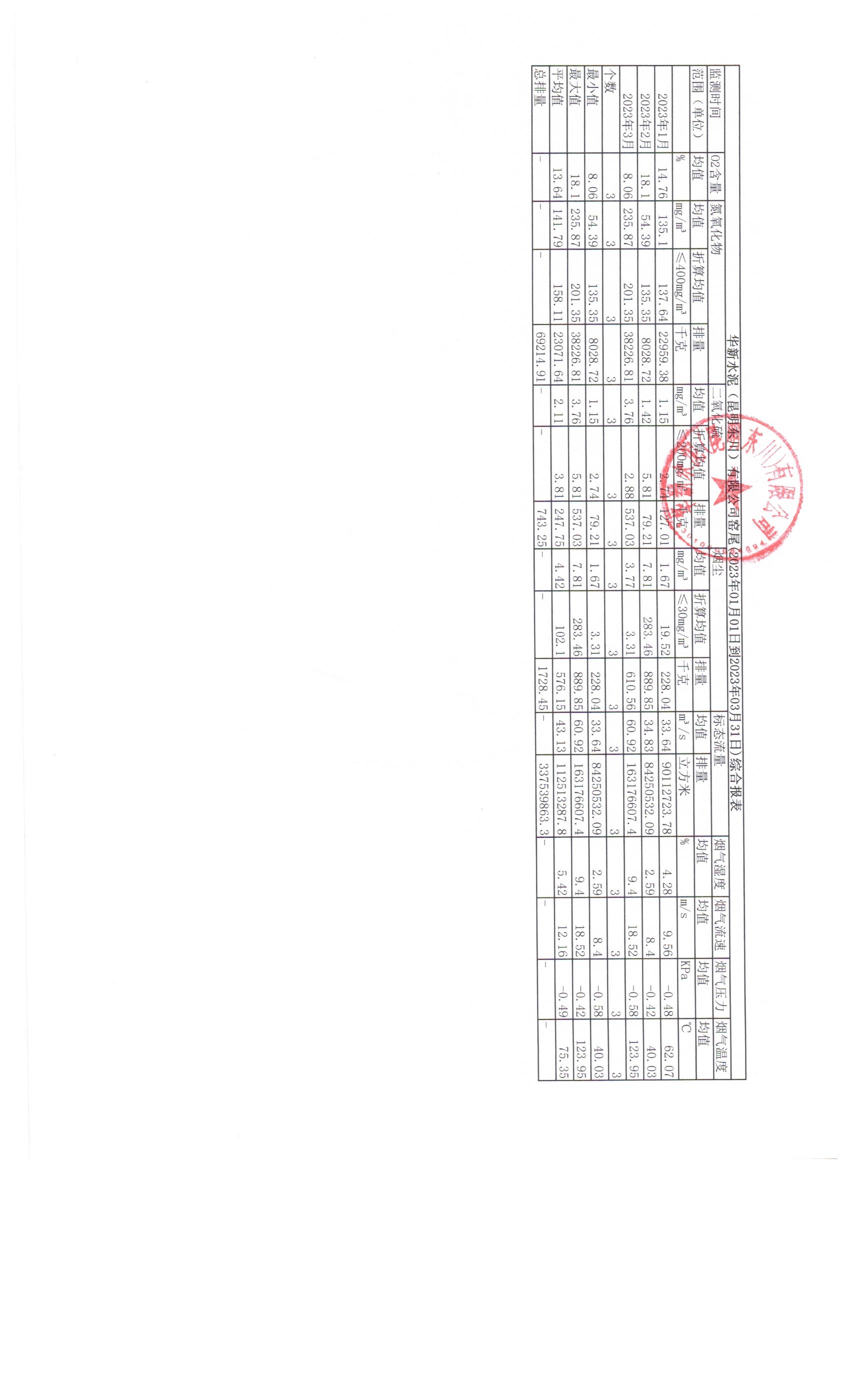 3、華新水泥(昆明東川)有限公司2023年第一季度窯頭煙氣在線監(jiān)測月平均值季報表
